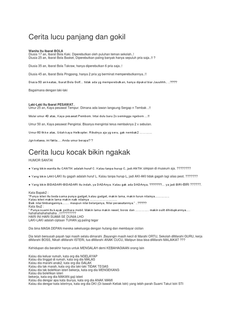 Cerita lucu panjang dan gokil. Kumpulan Humor Lucu Cerita Pendek ini didedikasikan untuk anda yang sedang mencari hiburan karena rutisitas dan aktifitas sehari andaDan akan membuat anda tertawa terbahak-bahak. Sejak kecil ia belum pernah memakai BH. Boleh ya bu Ibu.