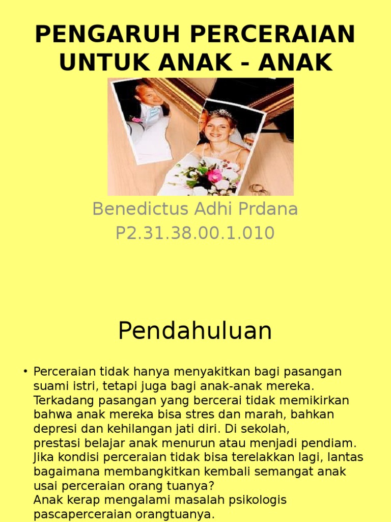 Perceraian mmg dilarang oleh agama dan siapapun tdk ingin mengalaminya tp jk perkawinan sudah tidak sehat apakah jg baik tuk dipertahankanItulah yang terjadi padaku saat iniUsia pernikahanku sudah 6 tahun dan dikaruniai 1 anak lelaki yg paling kecil perempuan dan baru 2 bln kmrn meninggal duniaTahun pertama pernikahan semua masih berjalan normal sampai musibah. Lingkungan keluarga yang tidak harmonis dan mengalami perpecahan akan mengarah pada kondisi broken home. Karen Idol melapor ke KPAI sebab selama 6 bulan ia tidak bisa bertemu dengan anak semata wayangnya lantaran disembunyikan sang suami.