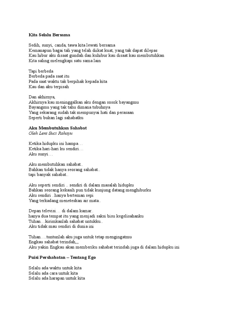 Dimana puisi ini bercerita mengenai tentang cinta atau pasangan hidup bahawa kita harus mampu memperjuangkan cinta bersama. Puisi tentang sahabat Sahabat merupakan seorang atau sekumpulan orang yang sangat dekat dengan kita berbeda dengan teman atau kawan. Punya sahabat yang baik tentu saja sangat menyenangkan hati.