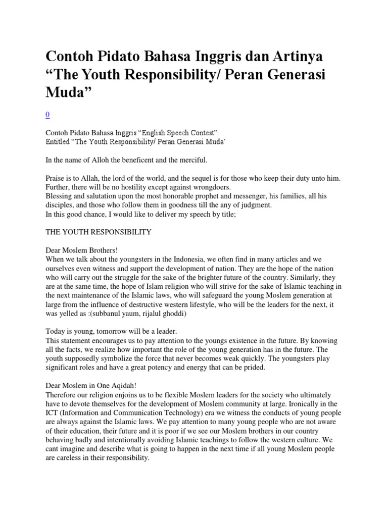 Dalam sejarah sebagaimana disebuat di contoh pidato bahasa inggris dan artinya dibawah ini telah dibuktikan dengan sumpah pemuda yang telah mempersatukan pemuda di seluruh Indonesia tanpa membedakan suku ras dan.
